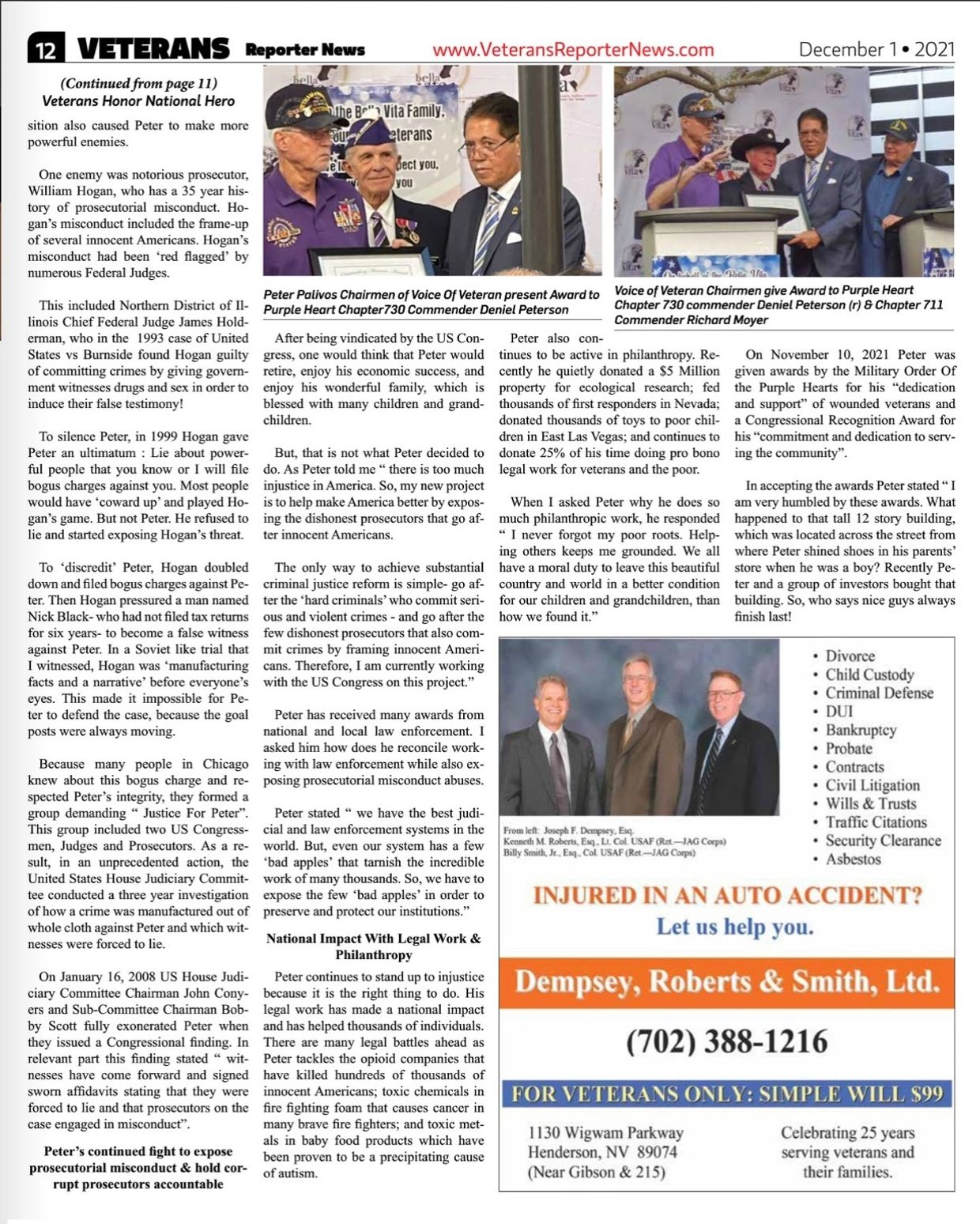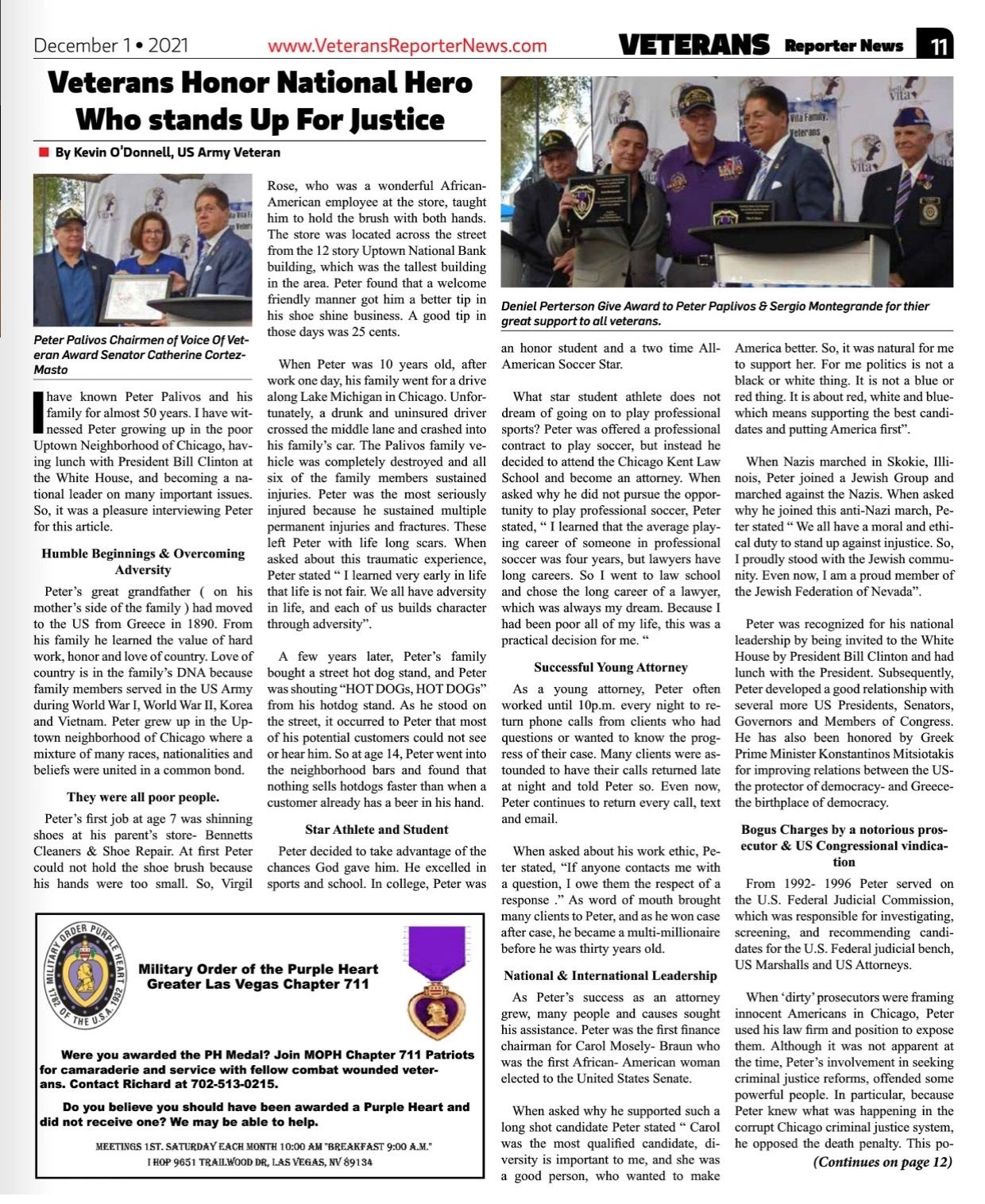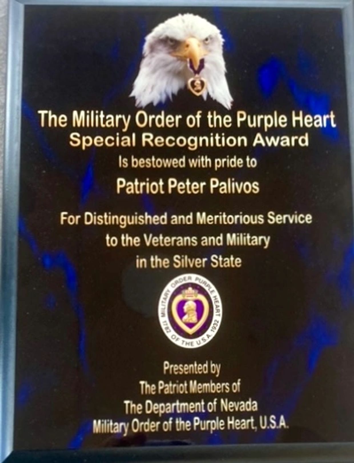 On November 4, 2023 Peter was grateful and humbled to be one of three individuals in Nevada to be awarded the Military Order of the Purple Heart Special Recognition Award by the National Order of the Purple Heart for his 30 years of contributions to the veteran and military community.